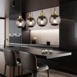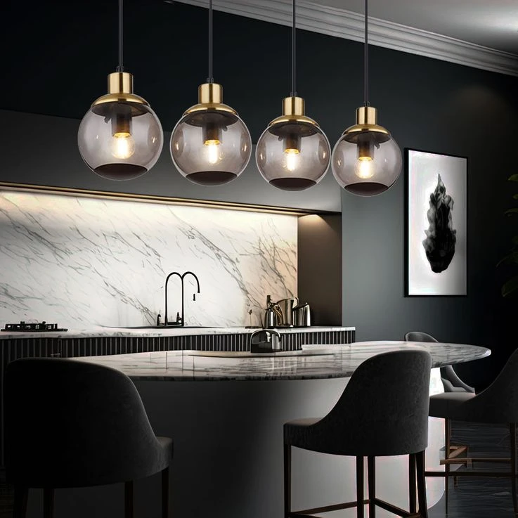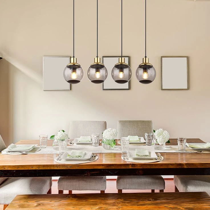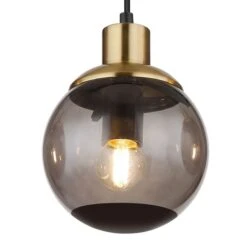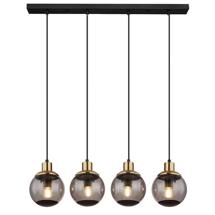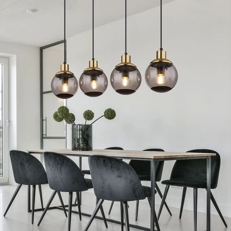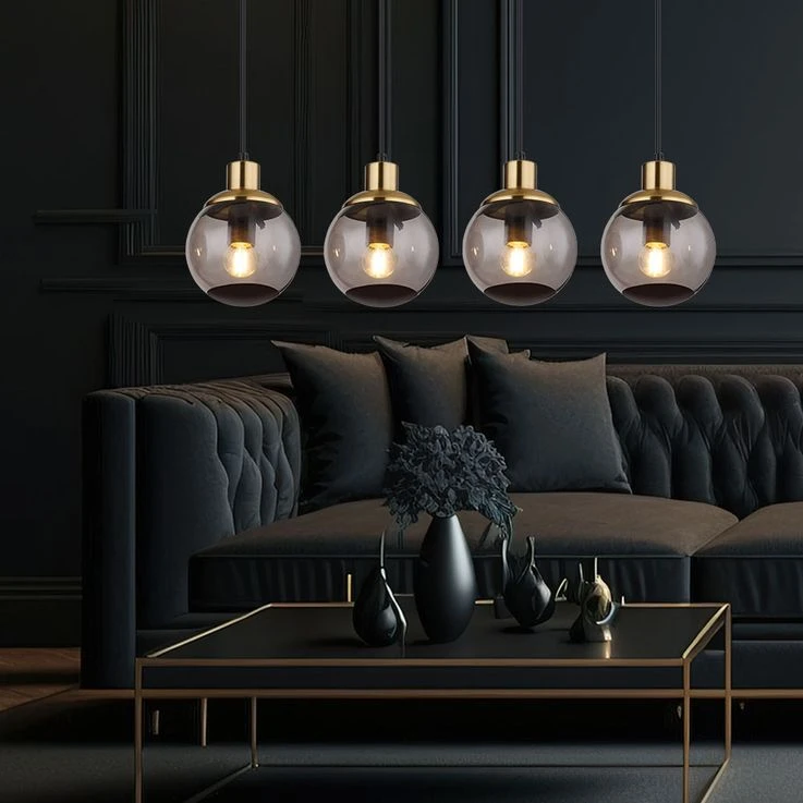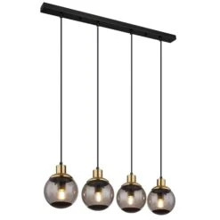 Aus einer eckigen Deckenbefestigung ragt ein Kabel und mündet an vier E27 Fassungen mit vier formschönen rauchfarbenen Glasschirmen und Verzierungen in Schwarz und Messing. Die E27 Fassungen ermöglicht Ihnen bis zu einer maximalen Leistung von 40 Watt, selbst über Lichtfarbe und Helligkeit zu bestimmen.