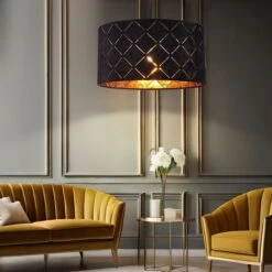 Durch den schwarzen Samt und das gitterförmige Muster im Lampenschirm (Ø38 cm) wird diese 120 cm hohe Innenleuchte zum Blickfang eines jeden Raums. Durch die freie Wahl des Leuchtmittels (E27/max. 40W) können Sie selbst über Lichtstärke und Lichtfarbe bestimmen.