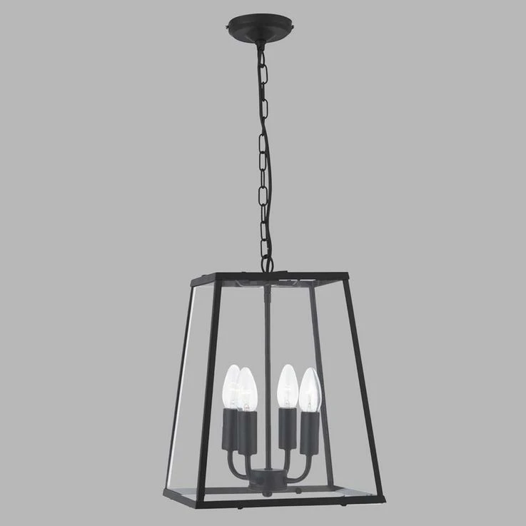 Diese 4flammige, mattschwarze Laterne mit klaren Glasscheiben hat einen einfachen, klassischen Look. Der mattschwarze, kegelförmige Schirm verfügt über vier Klarglasscheiben, auf denen sich eine attraktive Leuchte im Kerzenstil befindet, die zentral positioniert ist und eine helle Lichtquelle für jeden Raum bietet. Und der Schirm hängt elegant an einer schmalen schwarzen Kette von der Decke.