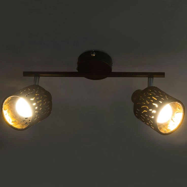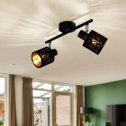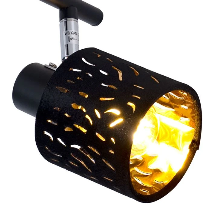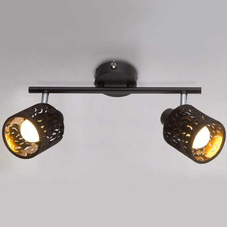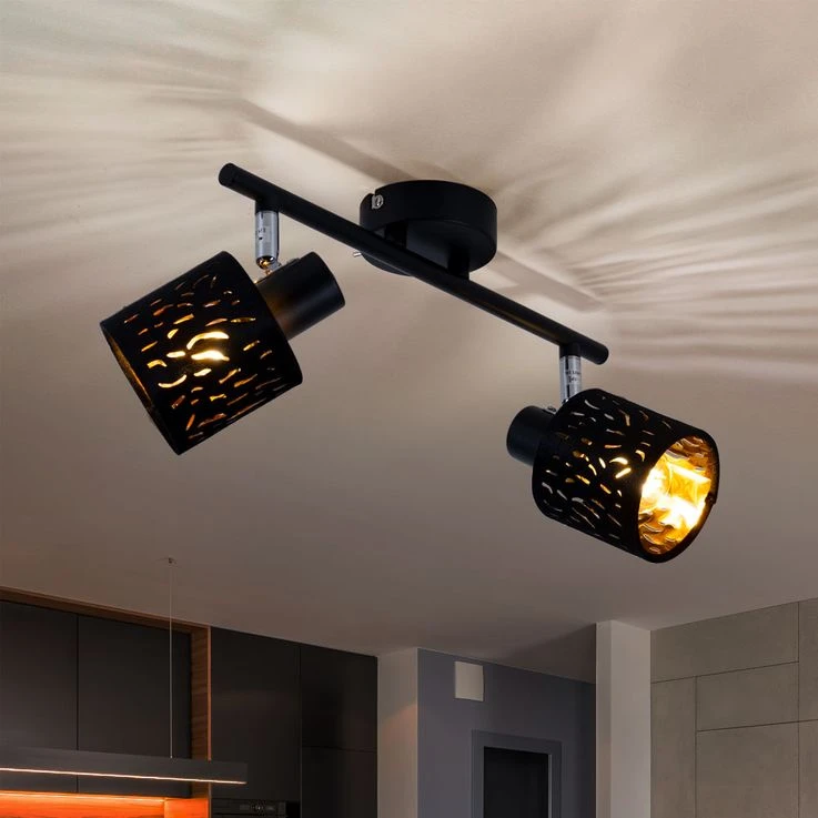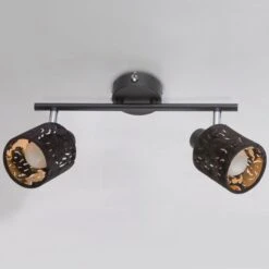 Die zwei beweglichen und an einem starren Arm befestigten gestanzten, zylinderförmigen Schirme dieses Strahlers sind mit schwarzem Samt überzogen, was wunderbar zur goldfarbigen Innenseite der Spots passt, die damit für ein wunderschönes Licht sorgen. Das schwarze Metall der Halterung sowie einzelne verchromte Teile ergänzen das Bild und machen diesen Strahler zu einem wahren Hingucker.