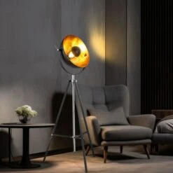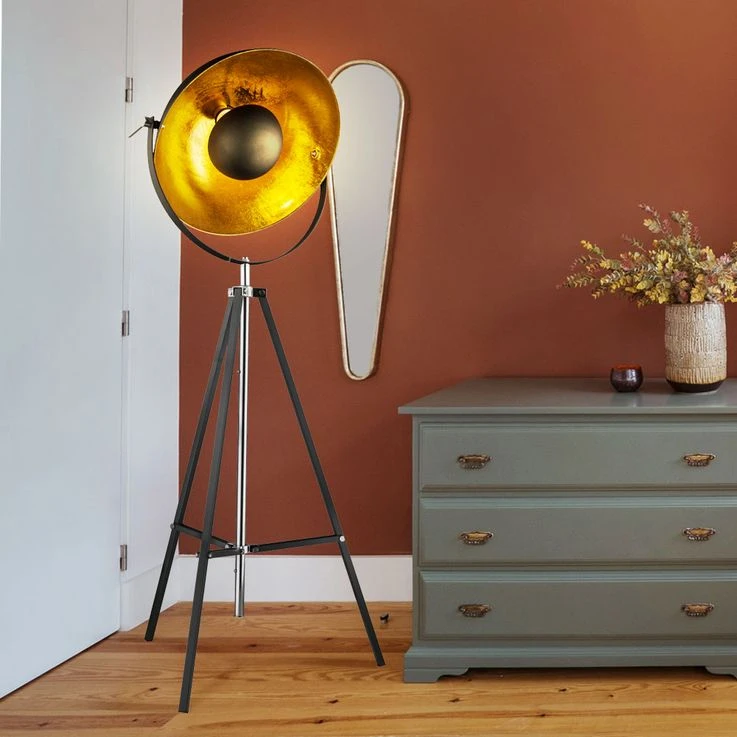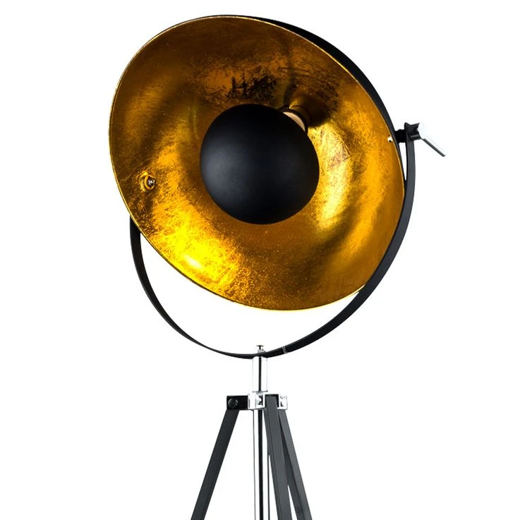 Der Schirm ist schwenkbar und innen goldfarben. Außerdem ist diese Lampe höhenverstellbar, wird durch einen On-Off-Schalter bedient und verfügt über eine E27 Fassung, für die ein Leuchtmittel bis zu einer Leistung von 60 Watt frei gewählt werden kann.