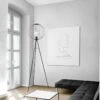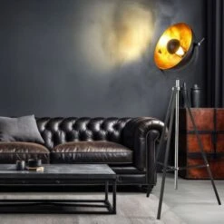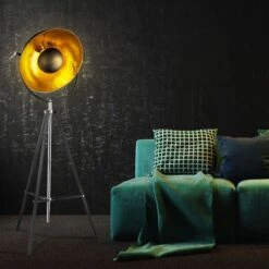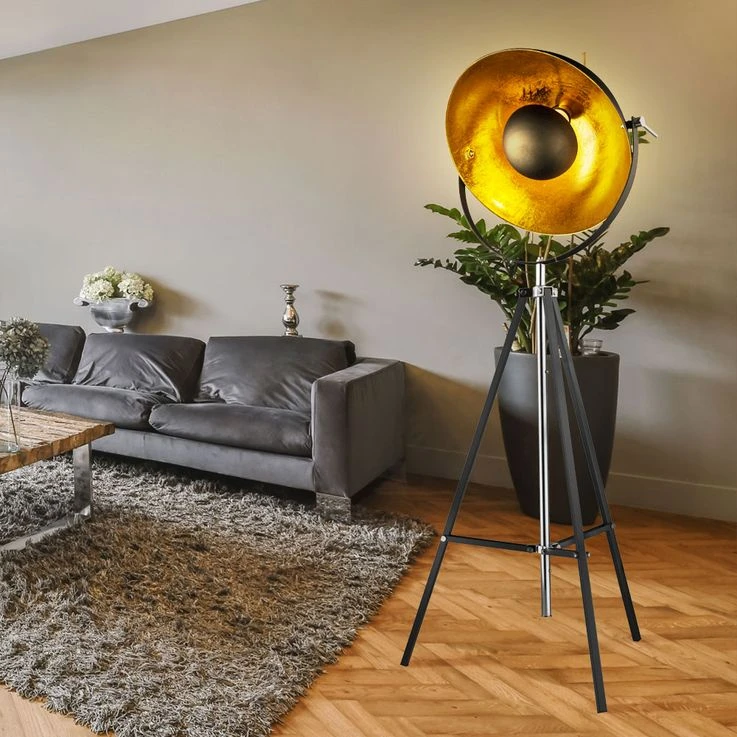 Diese schwarze, vierbeinige Stehlampe besticht durch ihre auffällige, originelle Optik.