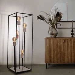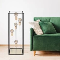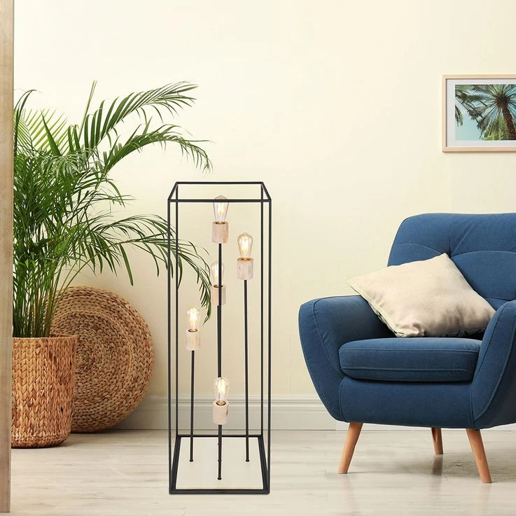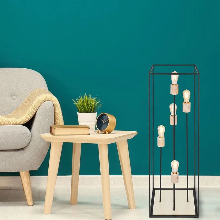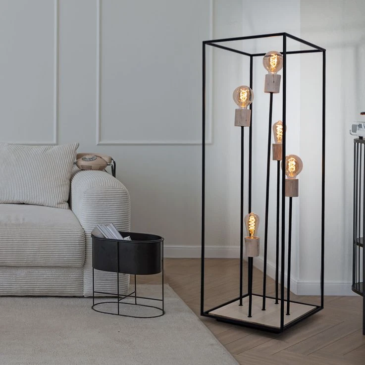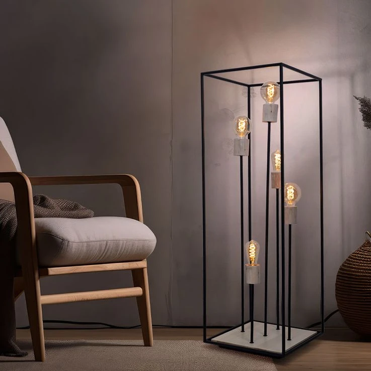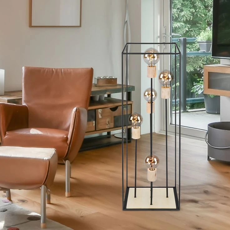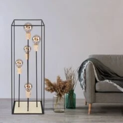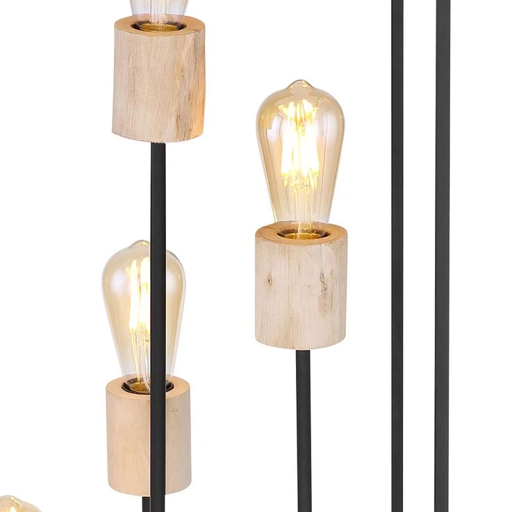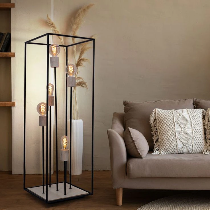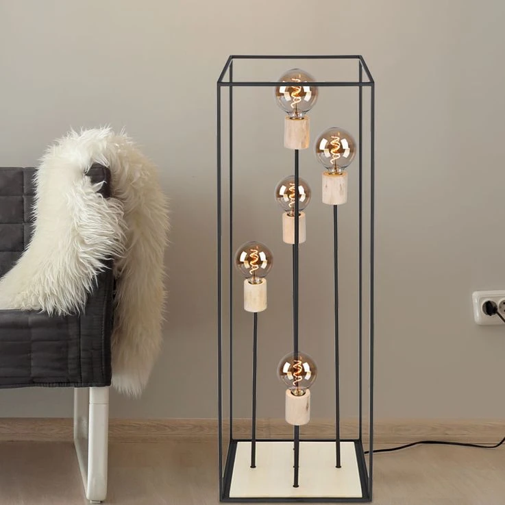 Das Licht kann durch das schwarze Metallgestell (H:120cm) zu allen Seiten hinaus strahlen. Freie Wahl des Leuchtmittels! Die Lampe besitzt fünf gängige E27-Fassungen. In diese können Leuchtmittel mit bis zu einer maximalen Leistung von 60 Watt eingesetzt werden. Für noch mehr Nachhaltigkeit empfehlen wir ein LED Leuchtmittel zu verwenden. Die Lampe erfreut mit Sicherheit jeden Besitzer mit ihrem einmaligen Charme.