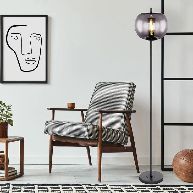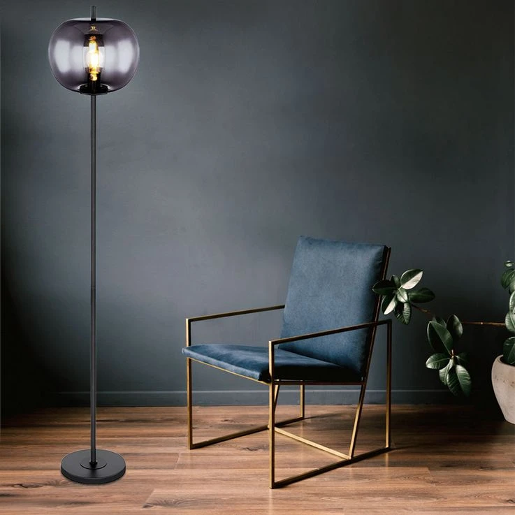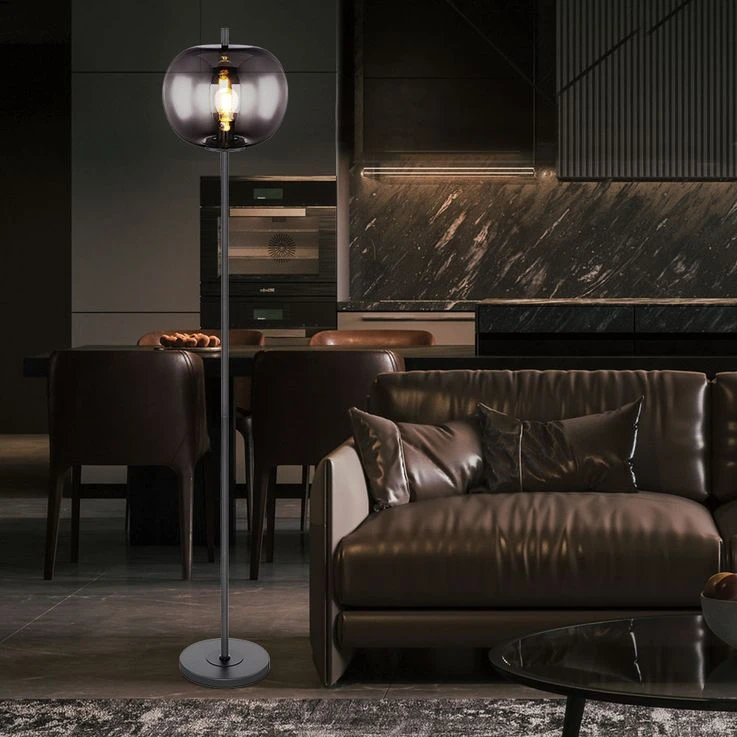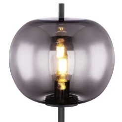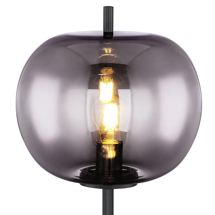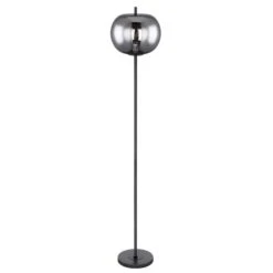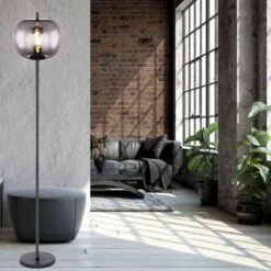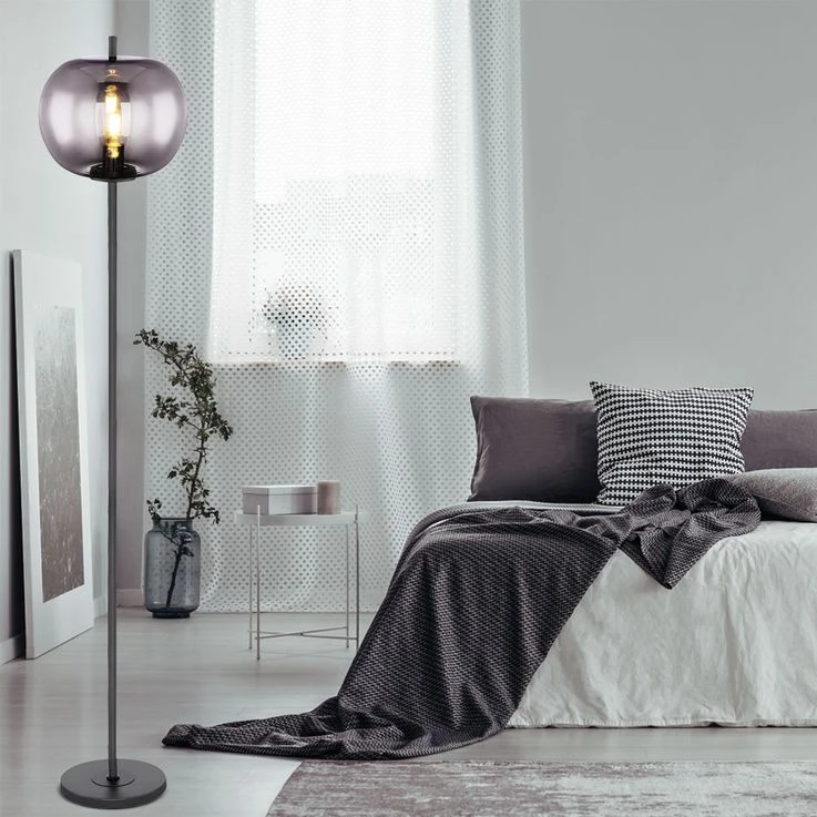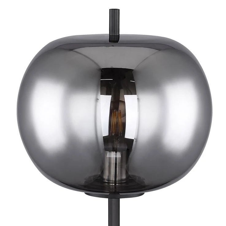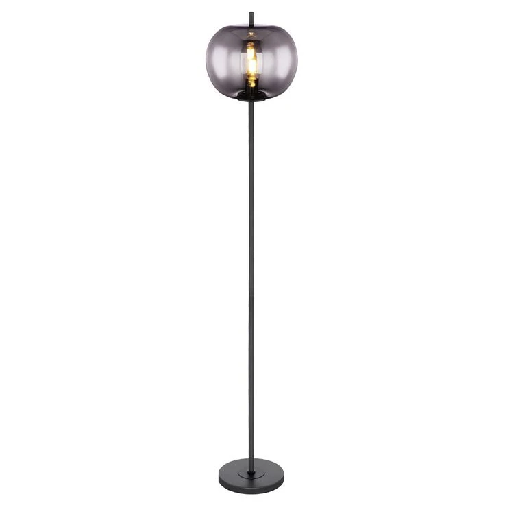 Diese Stehleuchte besteht aus schwarzem Metall mit einem rauchfarbigen Glas (Ø 30 cm).