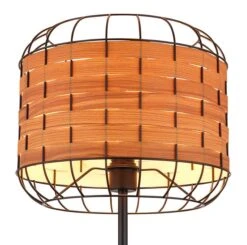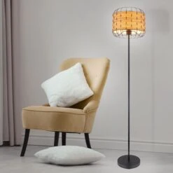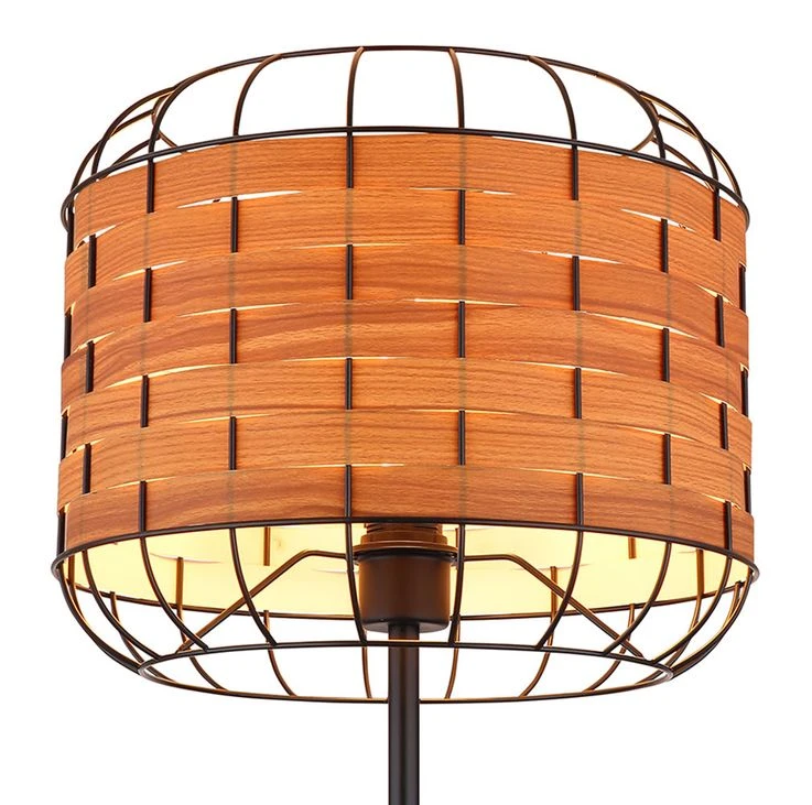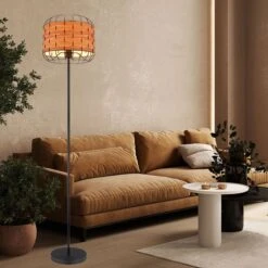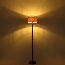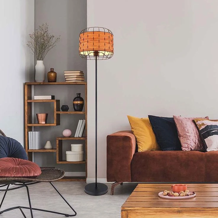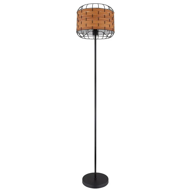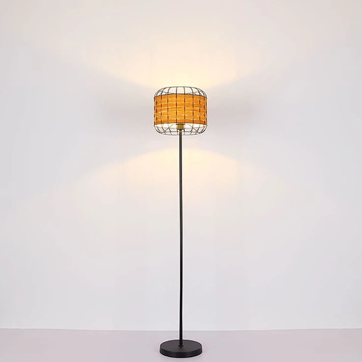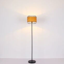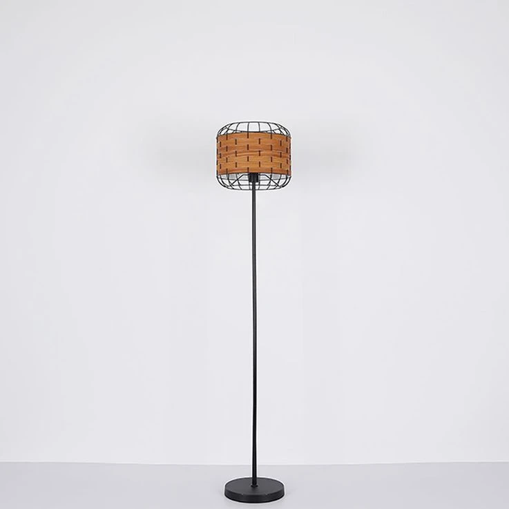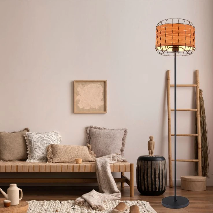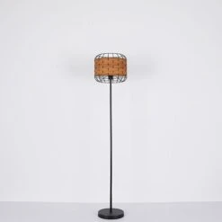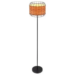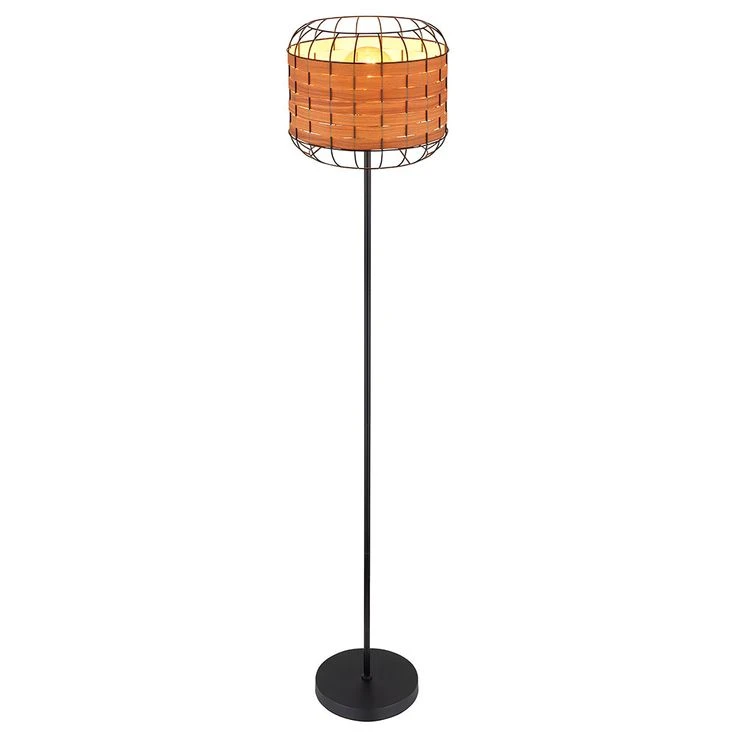 Aus einem rundem schwarz matten Sockel verläuft eine Metallstange mit einer Höhe von 1,6m zu einer E27 Fassung, welche mit einem Leuchtmittel Ihrer Wahl, bis zu einer maximalen Leistung von 60 Watt, bestückt werden kann. Die E27 Fassung wird von einem formschönen runden Metallkäfig-Schirm mit Kunststoffeinlagen (Ø35cm) umhüllt und vergibt somit der Leuchte den richtigen Touch.