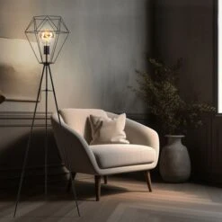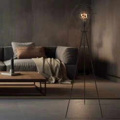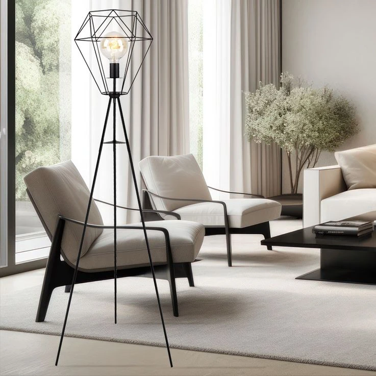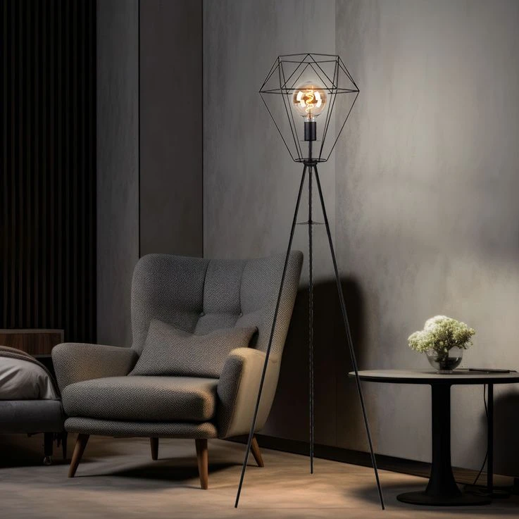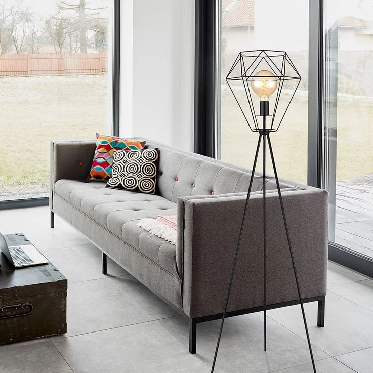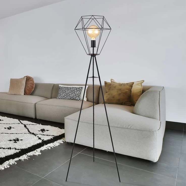 Die Leuchte besteht aus einem Dreibein aus schwarzen Metall welches an einer E27 Fassung endet und von einem Schirm (Ø35cm) in Form eines Metallgitters umhüllt wird. Die E27 Fassung überlässt Ihnen die Möglichkeit, bis zu einer maximalen Leistung von 60 Watt, selbst über Ihr Leuchtmittel zu bestimmen.