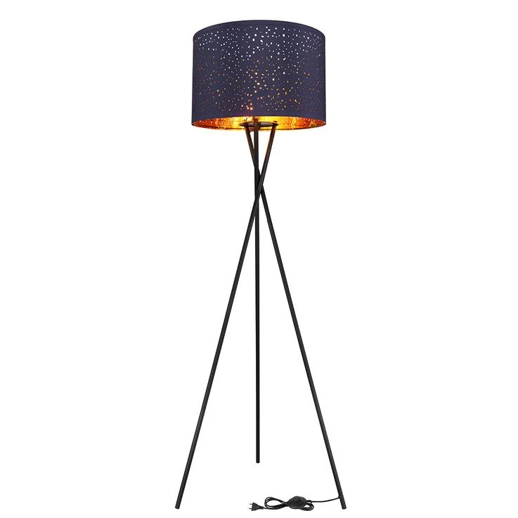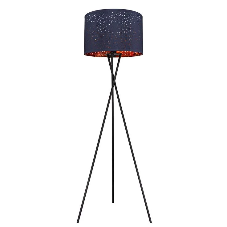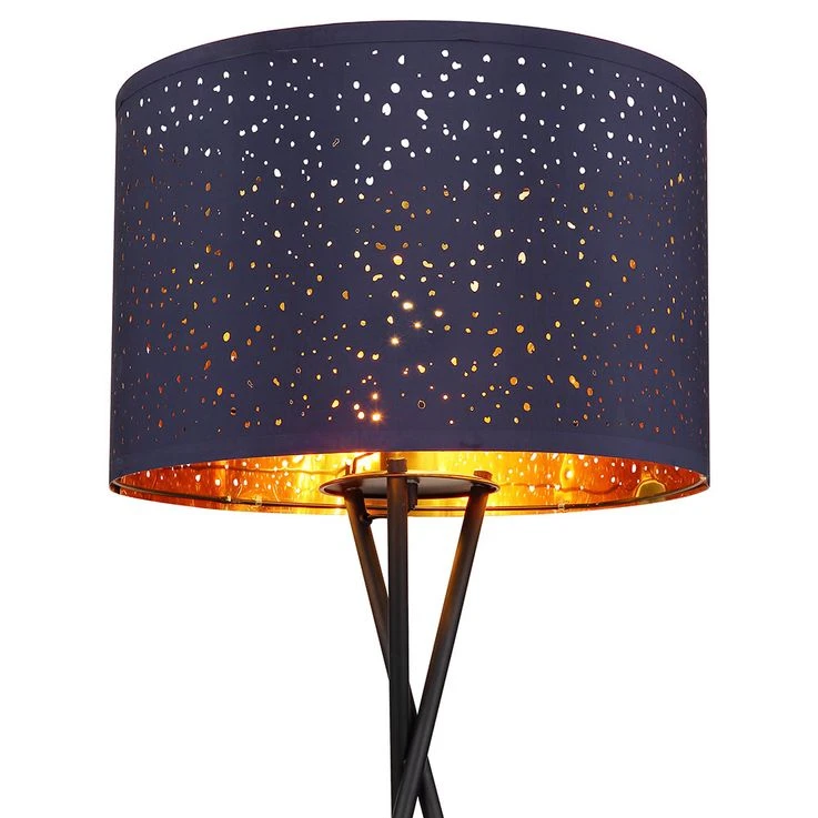 - MATERIAL/FARBE: Die aus schwarzem Metall gefertigte Stehleuchte verfügt über einen blauen Lampenschirm mit Musterstanzungen und kupferfarbener Innenseite.