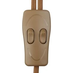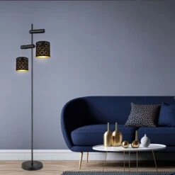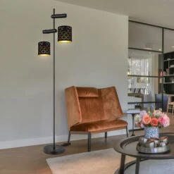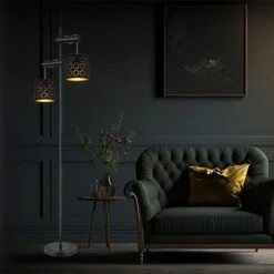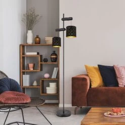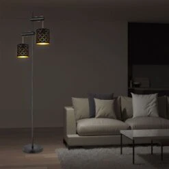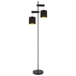 Die Stehleuchte besteht aus 2 schwarz matten Schirmen mit Dekorstanzungen welche jeweils mit einer E27 Fassung ausgestattet sind und an goldfarbenen Kabeln hängen. Diese sind an der 1,5m hohen schwarz matten Metallstange höhenverstellbar.
