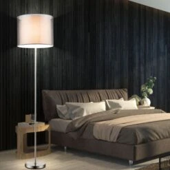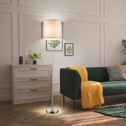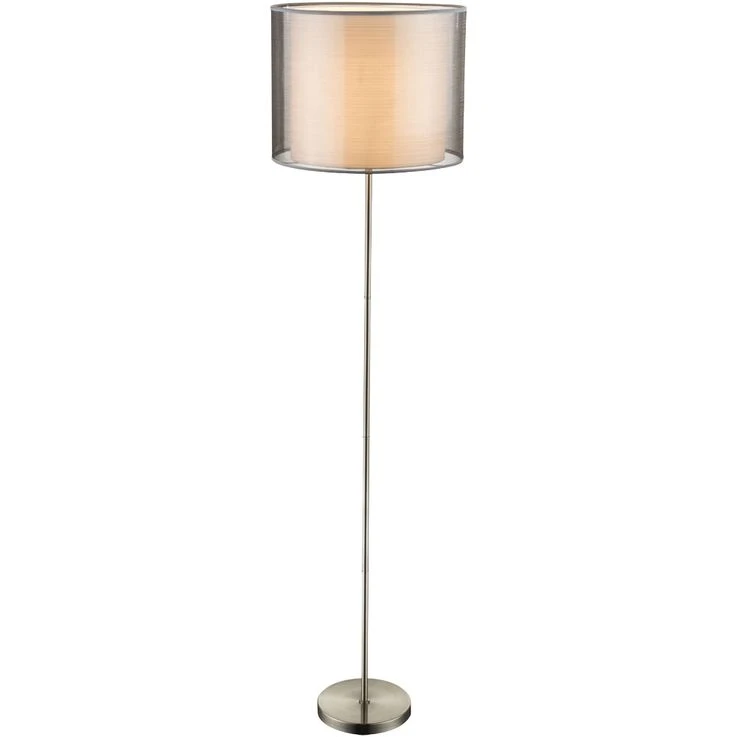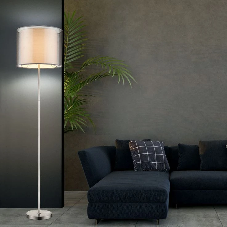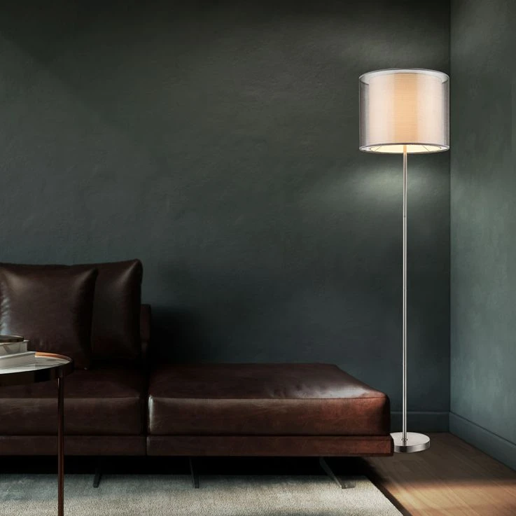 - MATERIAL: Diese Stehleuchte wurde aus einem Lampengestell aus mattem Nickel hergestellt und wird von einem Lampenschirm aus Textil und Kunststoff vervollständigt.