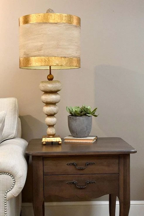 Retro-inspirierte Tischlampe mit goldenem Sockel und strukturierten Kieselsteinformen in aufsteigenden Größen. Strukturierter Schirm mit gestreiftem Rand aus Blattgold und kugelförmigem Endstück.