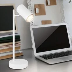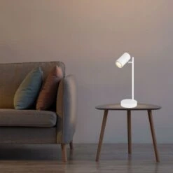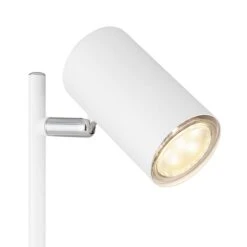 Die aus weißem Metall gefertigte Tischleuchte besteht aus einem runden Metallsockel, an dem ein Stab mit einer schwenkbaren, von Metall ummantelten GU10-Fassung fixiert ist. Diese können mit einem LED-Leuchtmittel Ihrer Wahl bestückt werden, wodurch Sie die Möglichkeit haben, Lichtfarbe und Helligkeit individuell zu bestimmen.