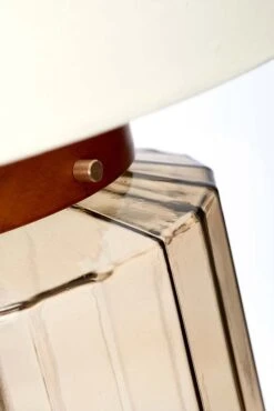 Lugas unverwechselbarer Sockel aus recyceltem Glas mit seinen starken vertikalen Linien verleiht einen kühnen und dennoch eleganten visuellen Reiz. Mit seiner Holzkappe und feinen Metalldetails kombiniert Luga zeitgenössischen Stil mit einem wärmeren, erdigen Gefühl. Es wird durch einen in Großbritannien handgefertigten Trommelschirm aus Polycotton ergänzt.