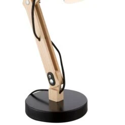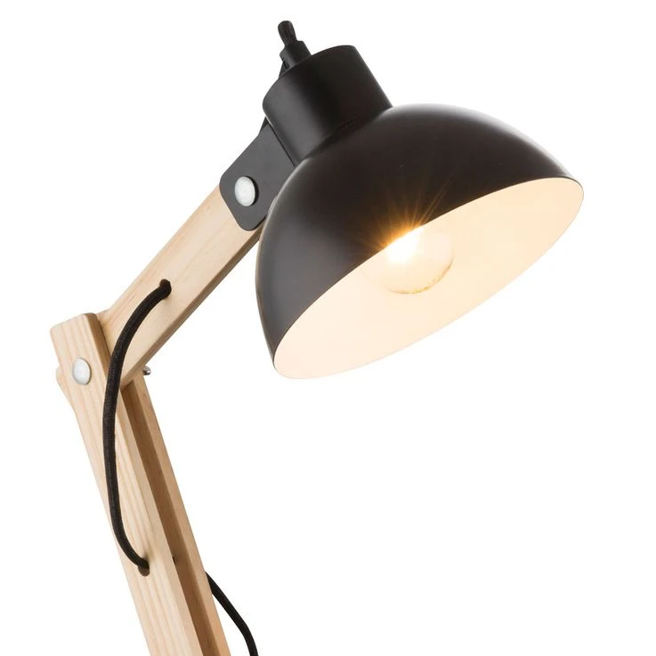 Die Tischlampe Tongariro besteht aus hellem Holz und schwarzem Metall.