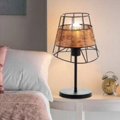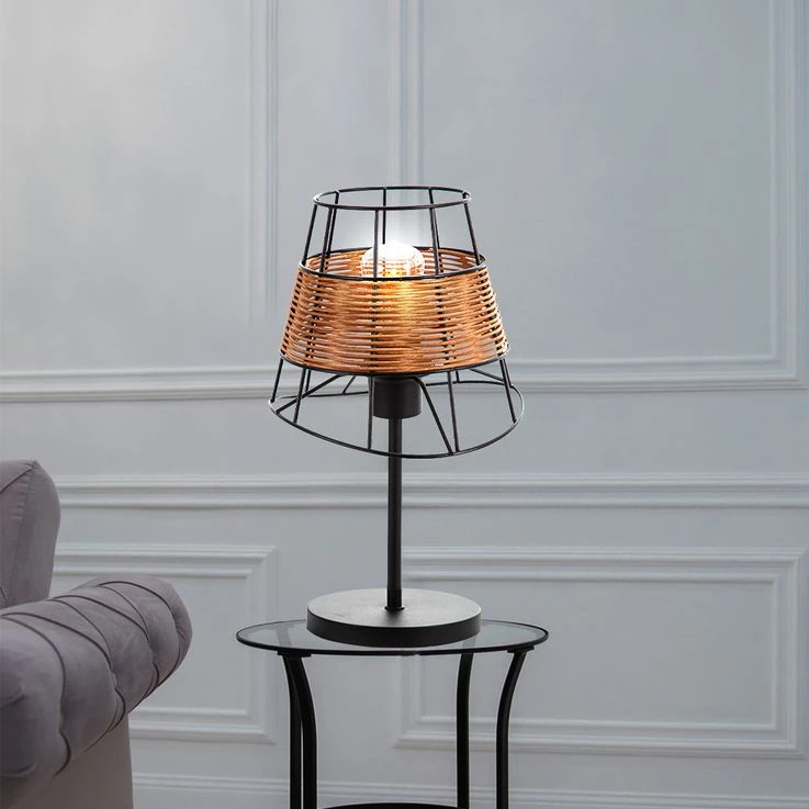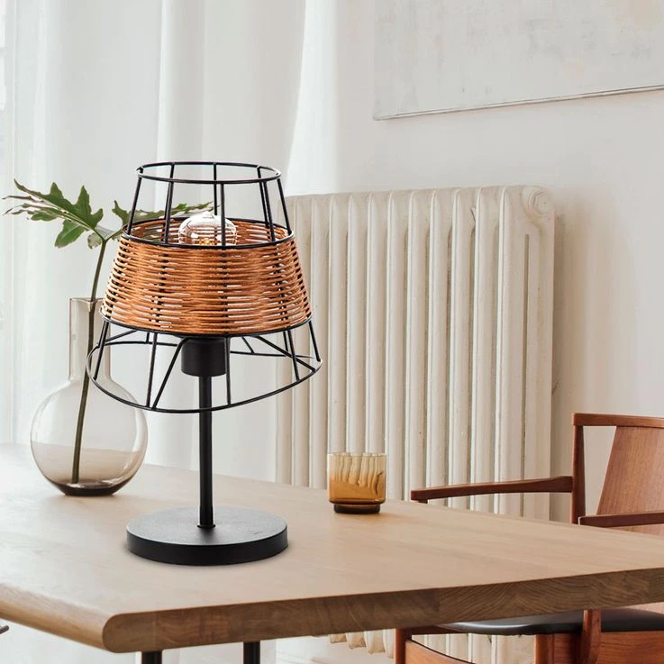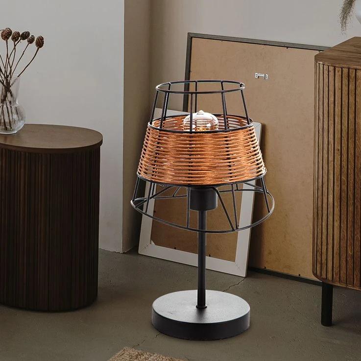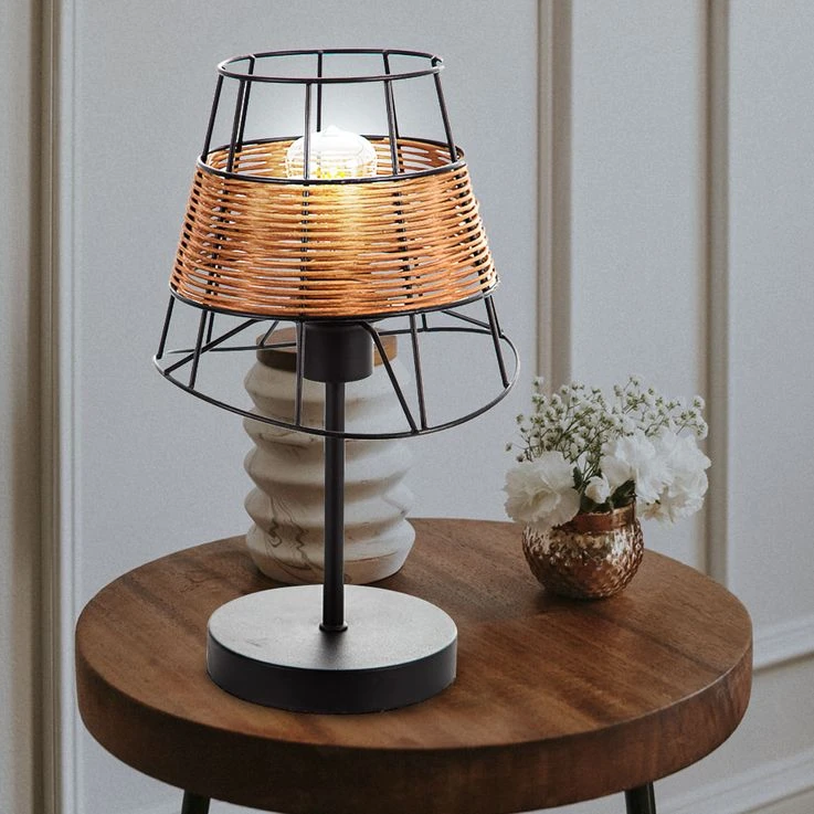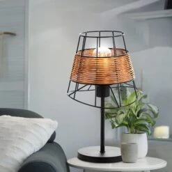 Diese dekorative Tischleuchte im angesagten Käfig-Design besticht mit einem interessanten Materialmix aus Metall und Rattan und avanciert dadurch zum echten Hingucker in Ihrem Wohnbereich.