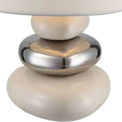 Die Basis bildet ein Turm aus drei Keramiksteinen und der Schirm aus beigem Textil verfügt über eine E14 Fassung, welche die freie Wahl des Leuchtmittels (max. 40W) ermöglicht.