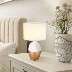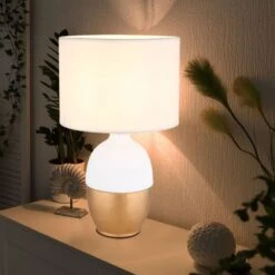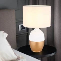 An einem oval förmigen Standbein in den Farben Weiß und Gold befindet sich eine E14 Fassung mit einem Textilschirm (Ø 25 cm). Die E14 Fassung ermöglicht Ihnen bis zu einer maximalen Leistung von 40 Watt, selbst über Lichtfarbe und Helligkeit zu bestimmen. Aufgrund von Langlebigkeit und Stromersparnis empfehlen wir LED Leuchtmittel.