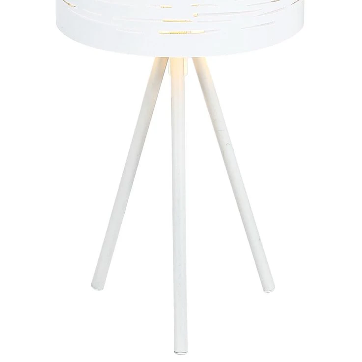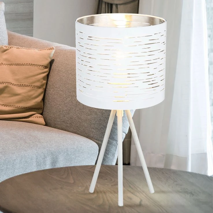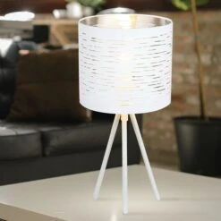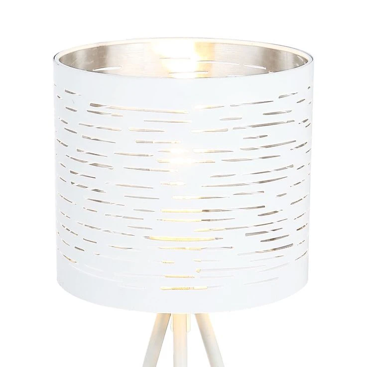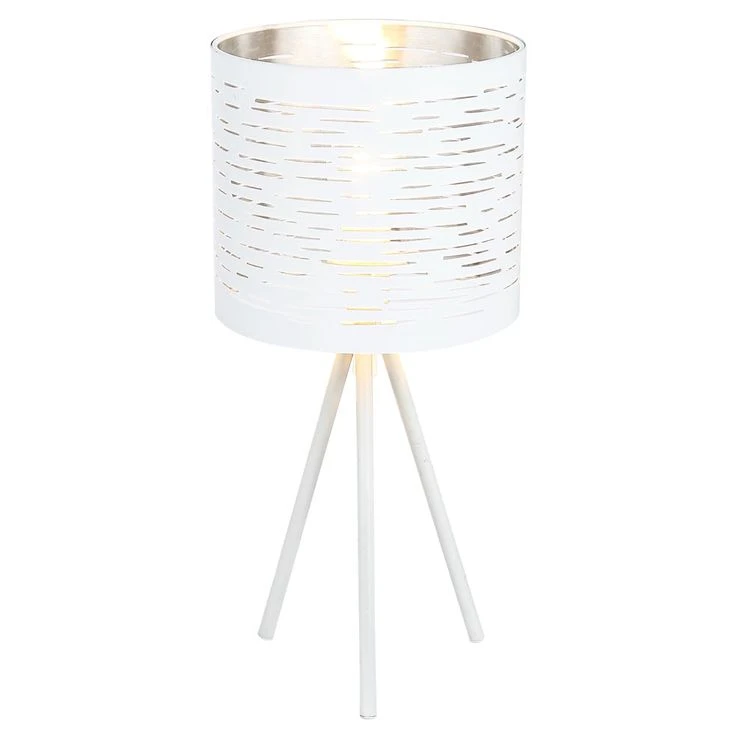 Durch die silbernen Streifen auf dem weißen Kunststoffschirm wird das Licht in einem wundervollen Effekt wiedergespiegelt. Diese dreibeinige Innenleuchte (Ø 17cm) mit einer Höhe von 35cm gibt Ihren Raum ein charmantes Aussehen. Durch das inkludierte 1,5m lange Kabel lässt sich die Position dieser Leuchte flexibel gestalten. Zudem verfügt diese Tischlampe über einen Schalter.