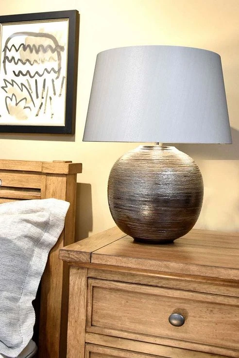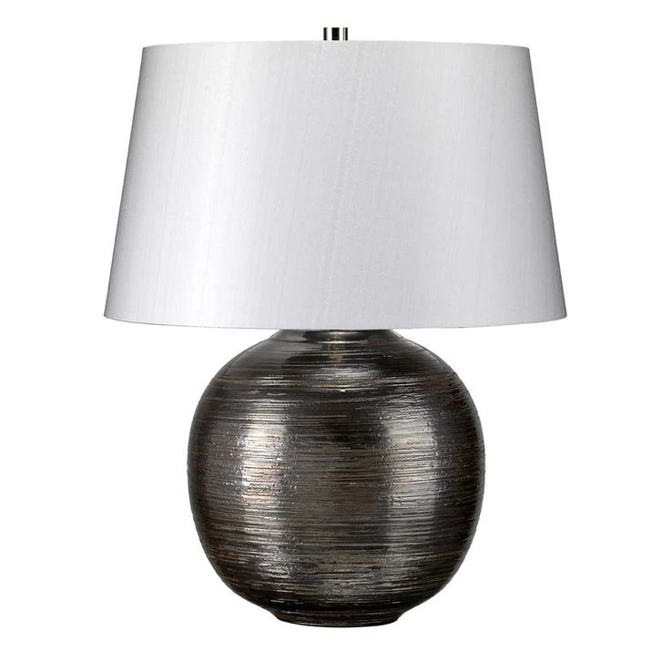 Handgeschnittene Tischlampe aus Keramik mit strukturierter Silberglasur. Beinhaltet einen silbernen transparenten Stoffschirm mit fester Rückseite mit silbernem Kartonfutter und einem polierten Nickel-Endstück.