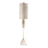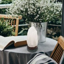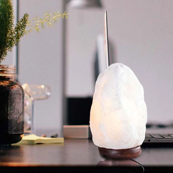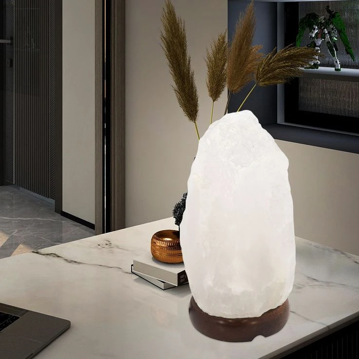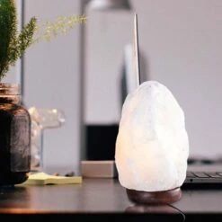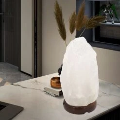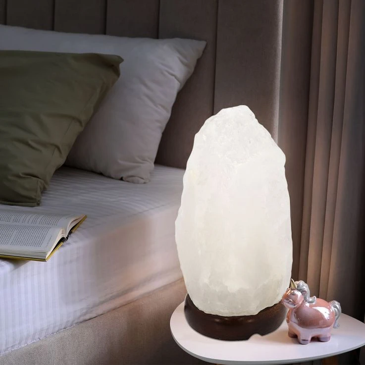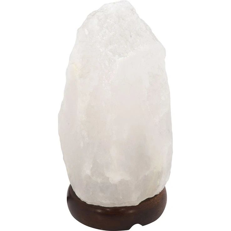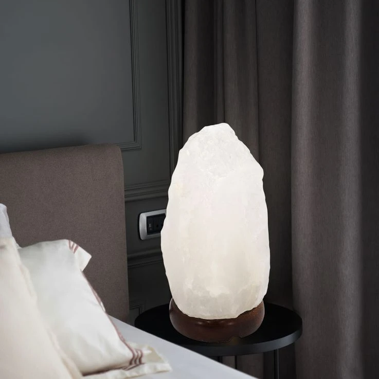 Diese 19 cm große Tischleuchte im Design eines Salzkristalls in Weiß befindet sich auf einem Sockel aus Holz (Ø12cm) und verfügt über eine E14 Fassung, welche mit einem Leuchtmittel Ihrer Wahl, bis einer maximalen Leistung von 15W, bestückt werden kann.