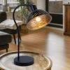Eine laue Brise, weißer Sand und Palmen, die sich in der Meeresbrise wiegen, inspirierten die South Beach-Familie des Designers Paul Gruer. Schwarz lackierte und Kittstreifen umrahmen den Schirm mit goldenen Palmblatt-Endstücken. Die Stehlampe hat einen sternförmigen Sockel, der so geätzt ist, dass er Kopfsteinpflasterstraßen ähnelt. Ein schwarz-cremefarbener Stiel wird mit einem passenden Farbton und einer Goldblattkugel gekrönt. Abgeschlossen mit einem Blattgold-Element.