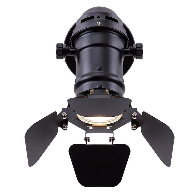 Dieser Strahler ist im Stil eines Filmset-Strahlers designt und besteht aus schwarzem Metall.