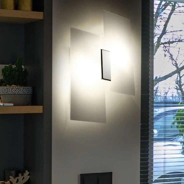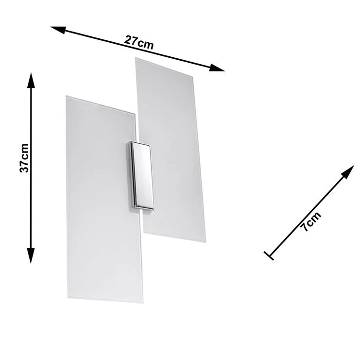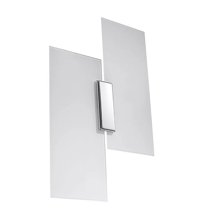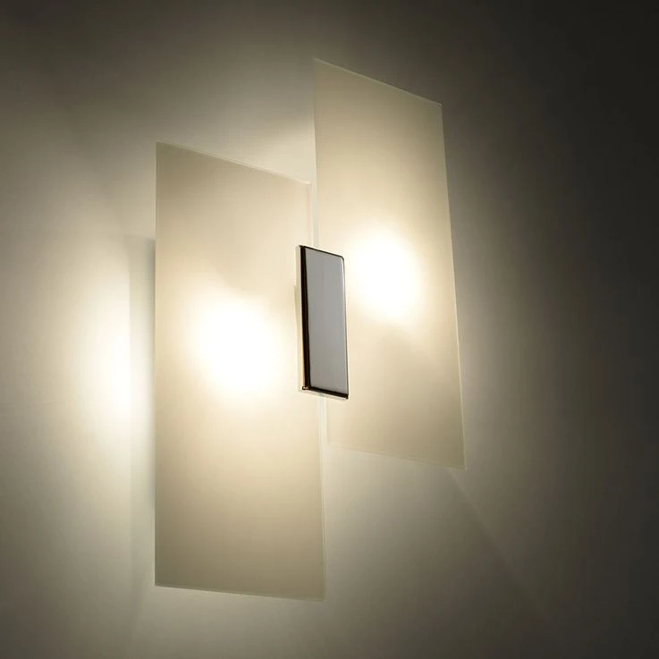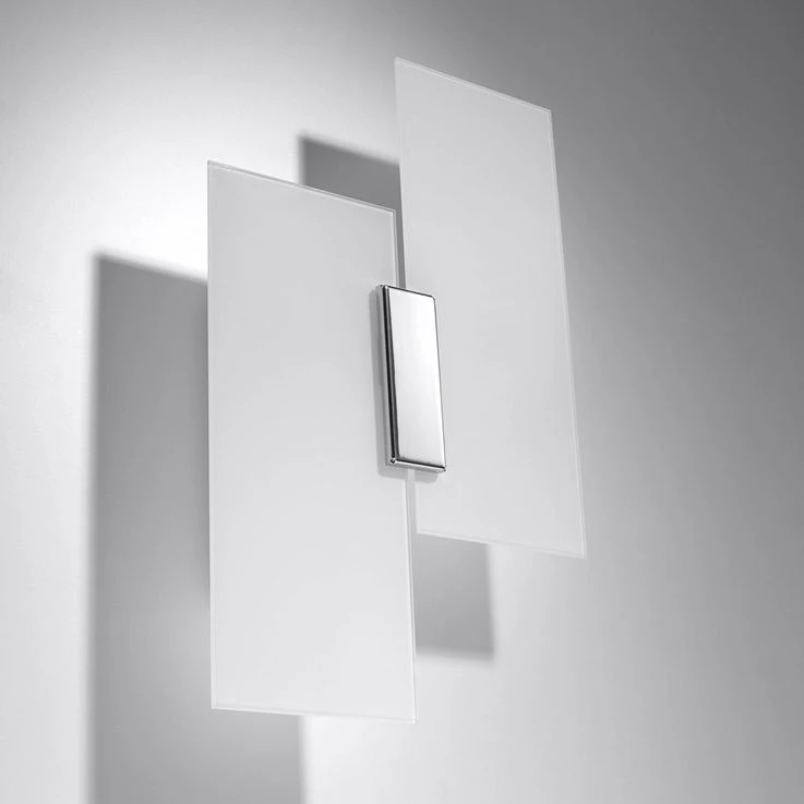 Diese moderne Wandleuchte besteht aus einem Chrombügel, der zwei satinierte Glasscheiben hält, unter welchem sich die Leuchtmittel befinden. Durch dieses Design wird für eine angenehme und blendfreie Beleuchtung gesorgt.