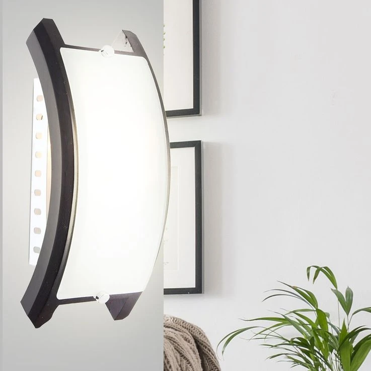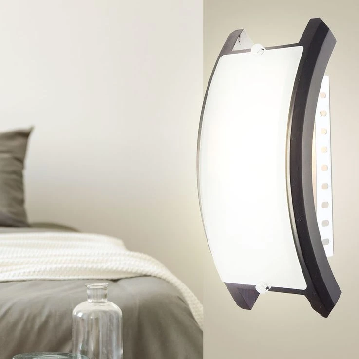 Diese Wandleuchte besticht durch ihren dunklen Holzrahmen, der den eckigen Glasschirm umgibt. Diese Modell ist sowohl für Einrichtungen mit Holzelementen, aber auch für Einrichtungen ohne Holzelemente geeignet. In jedem Fall überzeugt dieses stilsichere Element mit seiner Leuchtkraft.