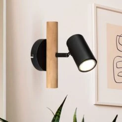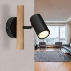 Dieser schlichter Wandstrahler überzeugt durch tolles Design aus Metall und Holz. Aus einer runden Wandbefestigung ragt eine 20 cm lange Holzstange, an der sich mit einem Überhang von 20 cm eine GU10 LED Fassung befinden. Die GU10 LED Fassung ermöglichen Ihnen bis zu einer maximalen Leistung von 5 Watt selbst über Lichtfarbe und Helligkeit zu bestimmen. Aufgrund von Langlebigkeit und Stromersparnis empfehlen wir LED Leuchtmittel zu verwenden.Â