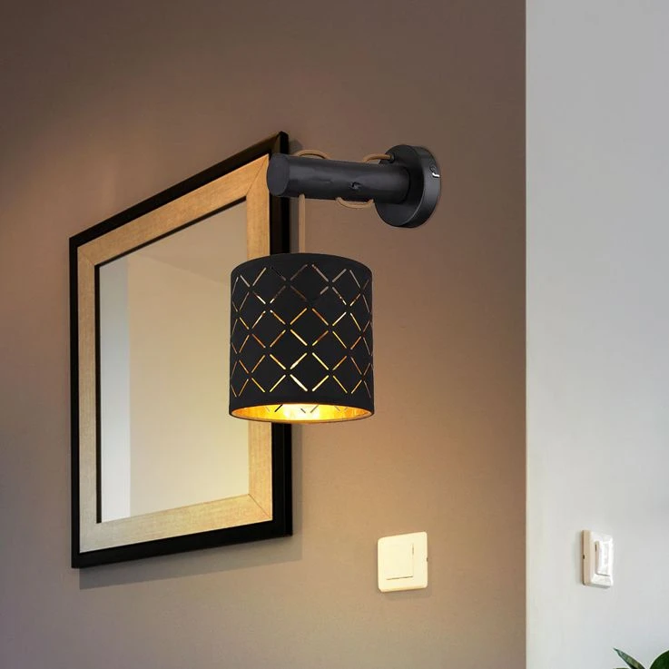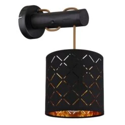 Die Wandleuchte besteht aus einem schwarz matten Schirm mit Dekorstanzungen welche mit einer E27 Fassung ausgestattet ist und an einem goldfarbenem Kabel hängt.