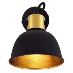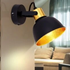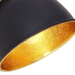 Der runde, bewegliche Lampenschirm, innen mit schwarz-blattgoldenem Metall, ist an einem runden Wandschild befestigt. Dieser Wandstrahler lässt sich mittels Knopf ein-/und ausschalten. Das äußere, elegante schwarze Metall der Lampe rundet das Design ab. Durch die freie Wahl des Leuchtmittels (E14/max. 25W) können Sie selbst über Lichtstärke und Lichtfarbe dieser Innenlampe bestimmen.