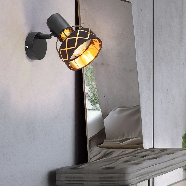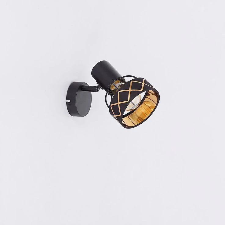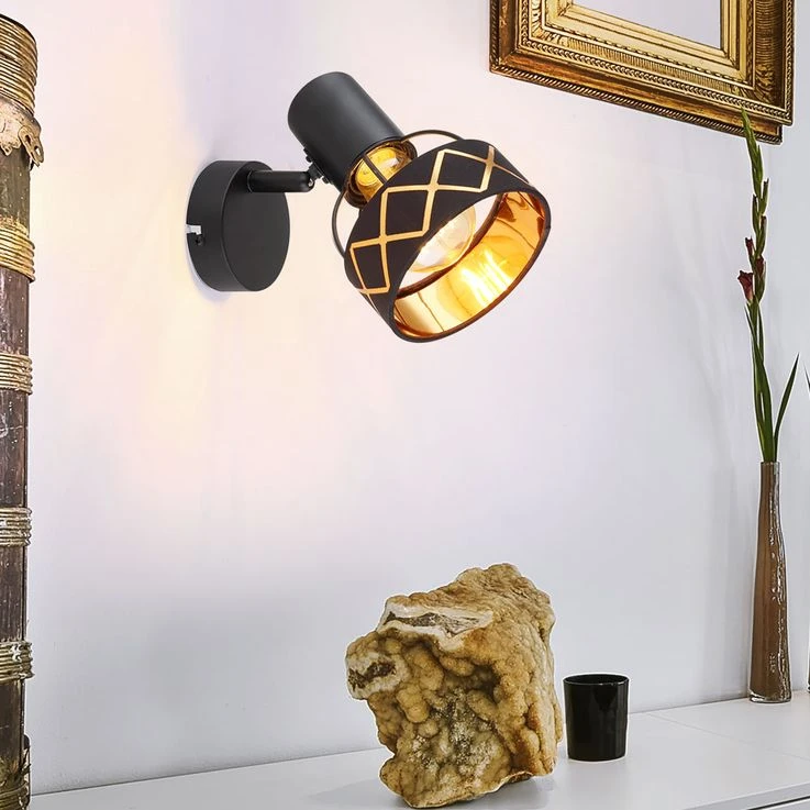 Der aus schwarzem Metall gefertigte Strahler verfügt über einen schwarzen Textilschirm, der innen golden getönt ist und ein linienförmiges Muster aufweist.